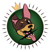 Cartoon image of a playful dog with a crown, winking and sticking out its tongue, inside a green circle.